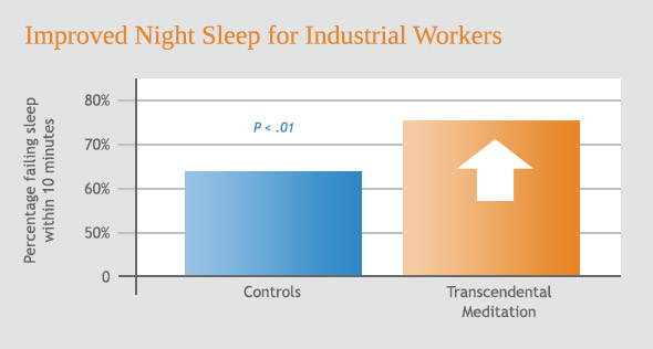 A study carried out by the Japanese National Institute of Industrial Health, established that 427 employees of a large industrial company (Sumitomo Heavy Industries) who learned TM were able to fall asleep more easily after 3 months than the control group of 308 employees at the same work place.
