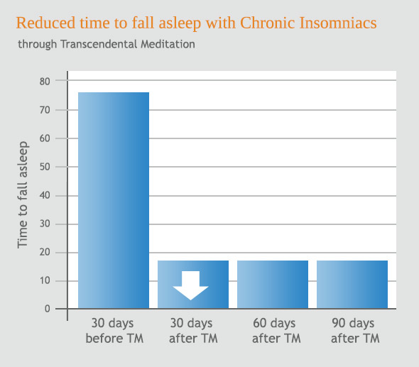The first TM research on insomnia was a small pilot study at the University of Alberta in Canada. A group of insomnia patients was asked to register the average amount of time it took to fall asleep, for 30 days prior to learning TM, and for 30, 60 and 90 days afterwards. The average time dropped from 75.6 minutes to 15 minutes and remained stable at that time.